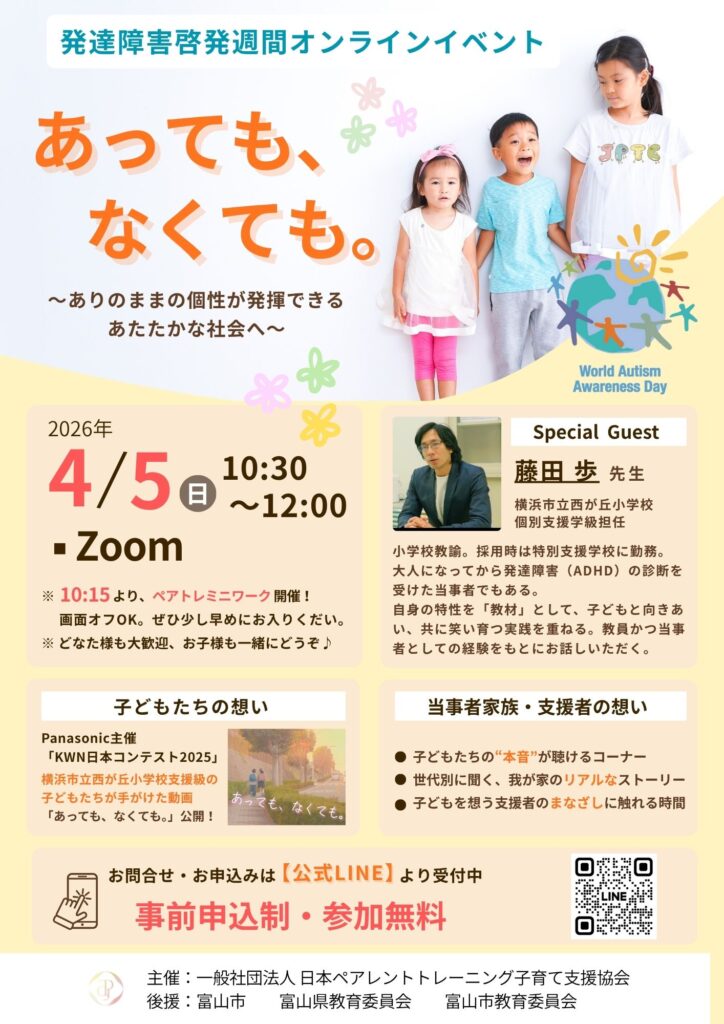 一般社団法人日本ペアレントトレーニング子育て支援協会が開催する啓発イベントは、今年で3回目。