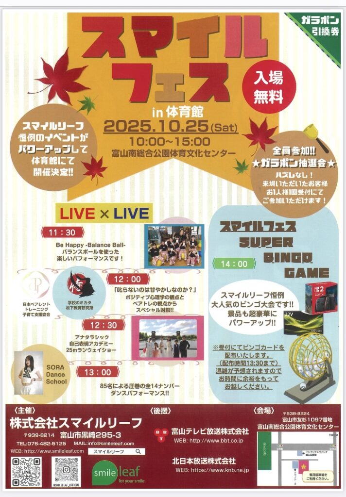 2025年10月25日(土)、富山県富山市にある富山南総合公園体育文化センターにて「スマイルフェスin体育館」が開催されました。